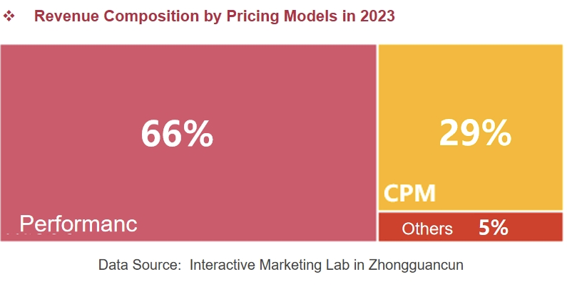 From the point of view of pricing method, there is a relatively large change in the market share of each type: Effective advertisements declined by 2.7 percentage point to 66.4% compared with the 69% market share in 2022, and the corresponding CPM advertisements market share increased by 2.6 percentage point to 28.5%, which indicates that Internet marketing has entered into a stage of structural adjustment, and advertisers' placement strategies have also changed.