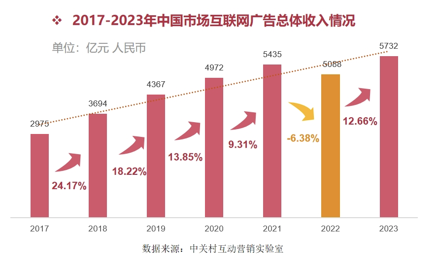 2023年,中国互联网广告市场规模预计为5732亿元人民币,较2022年增长12.66%。市场经历2022年的结构化调整与资源优化配置后,再次呈现出增长态势,说明中国互联网广告市场韧性十足。