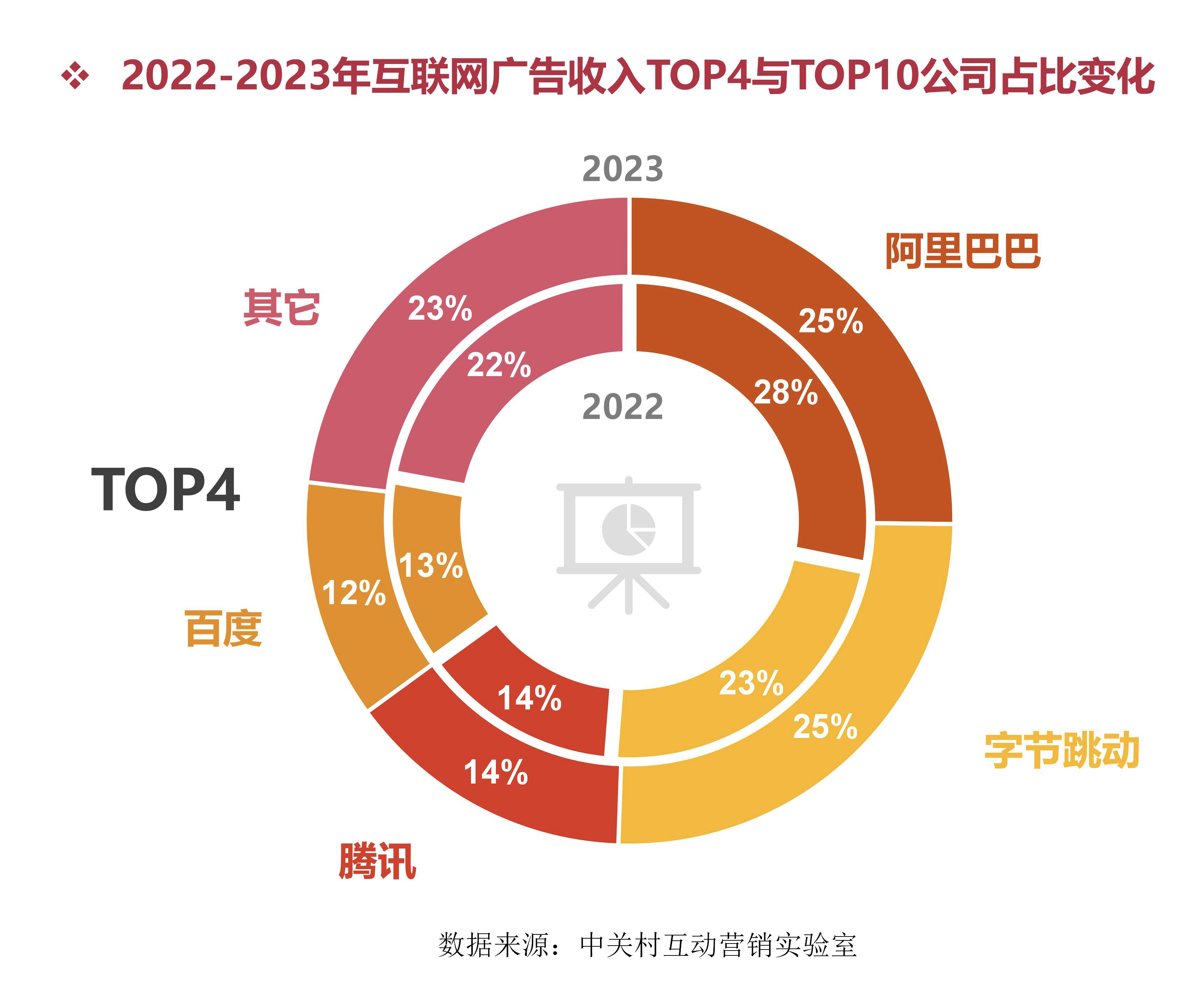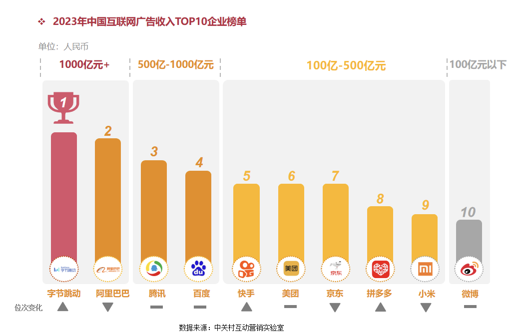 2023年,中国互联网巨头竞争格局略有调整,拥有抖音、今日头条等热门应用的字节跳动超越阿里与腾讯,成为营收第一大公司。
