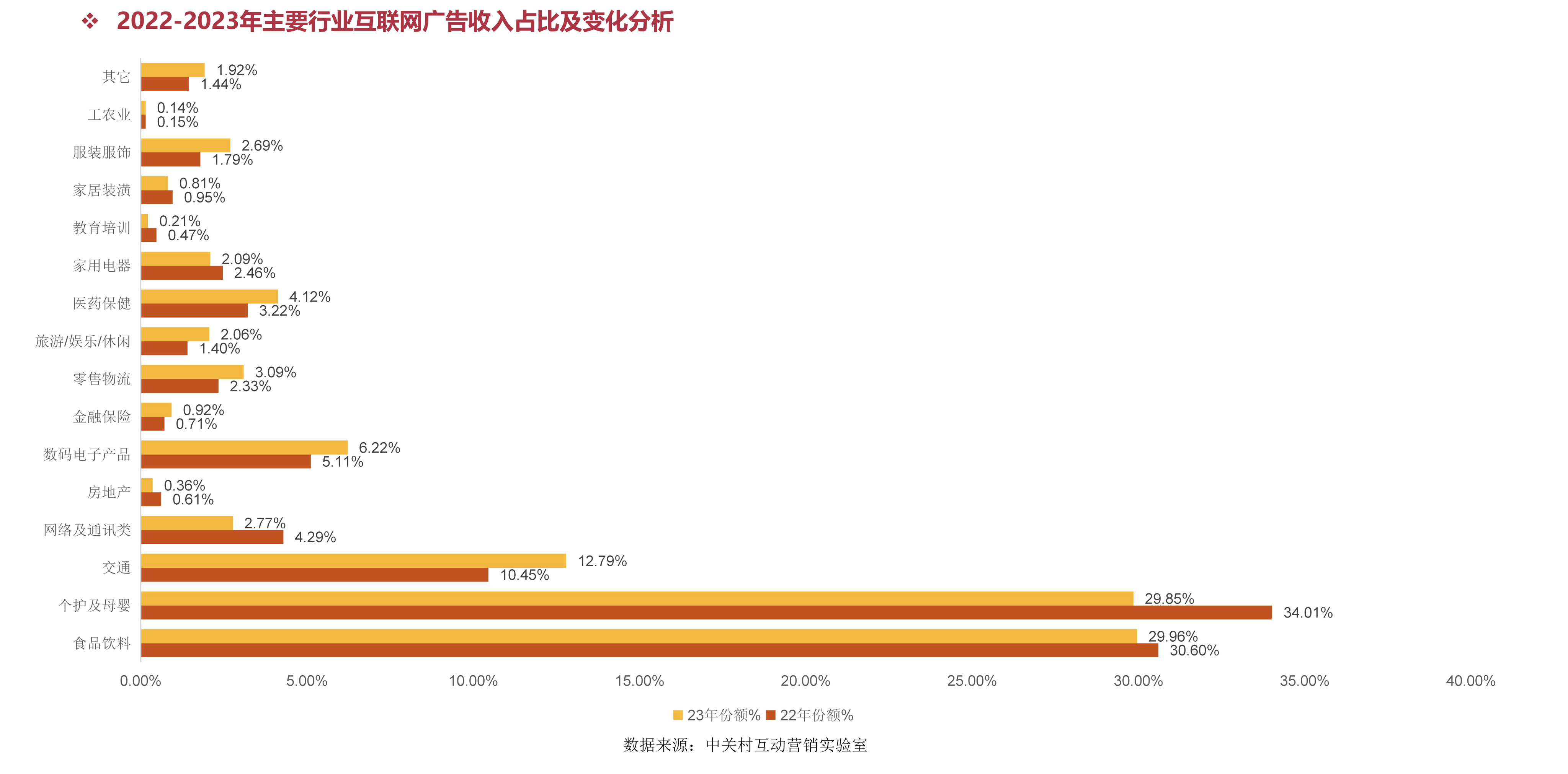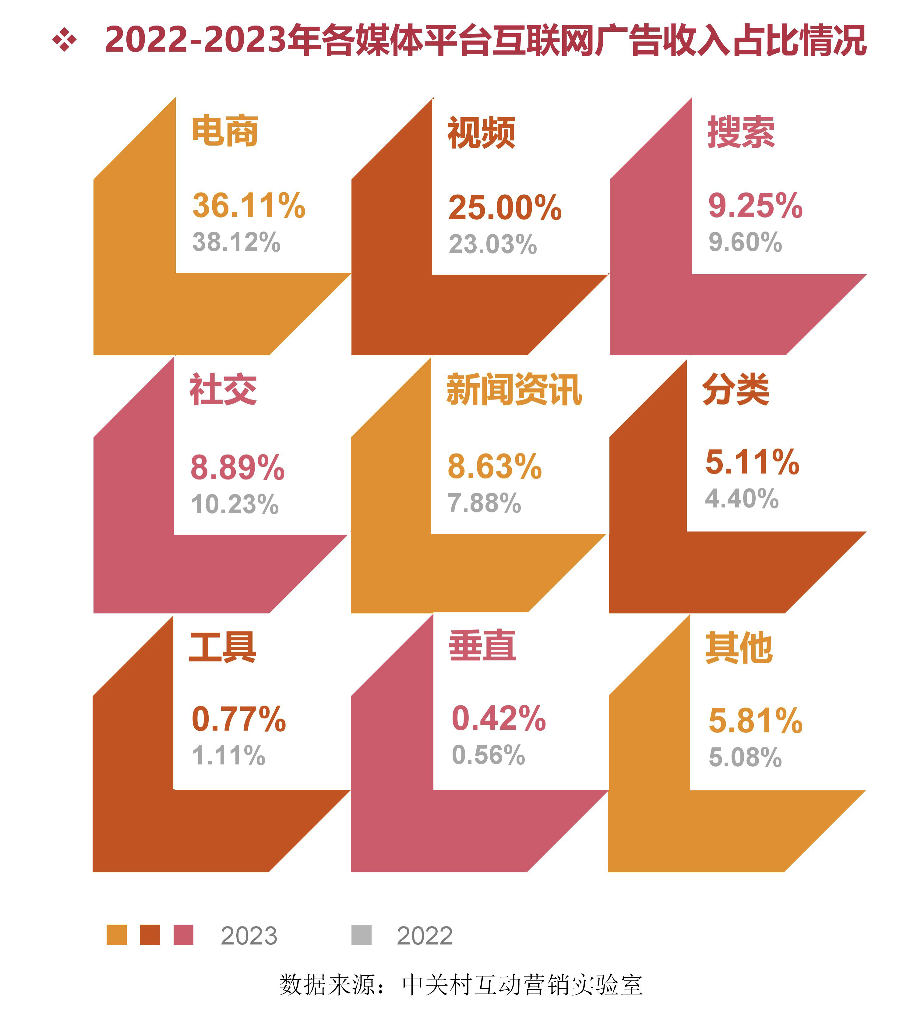 2023年,中国互联网广告市场规模与新冠疫情前2019年的市场规模4367亿元相比,增长31.26%,四年复合年增长率为7.04%。(2019年与2016年相比,三年复合年增长率为23.7%)。由此可见,疫情对中国互联网广告及营销市场影响显著,2023年的增长带有一定程度的恢复性。此外,互联网广告及营销进入结构性调整周期,也是四年复合增长率显著放缓的内生原因。