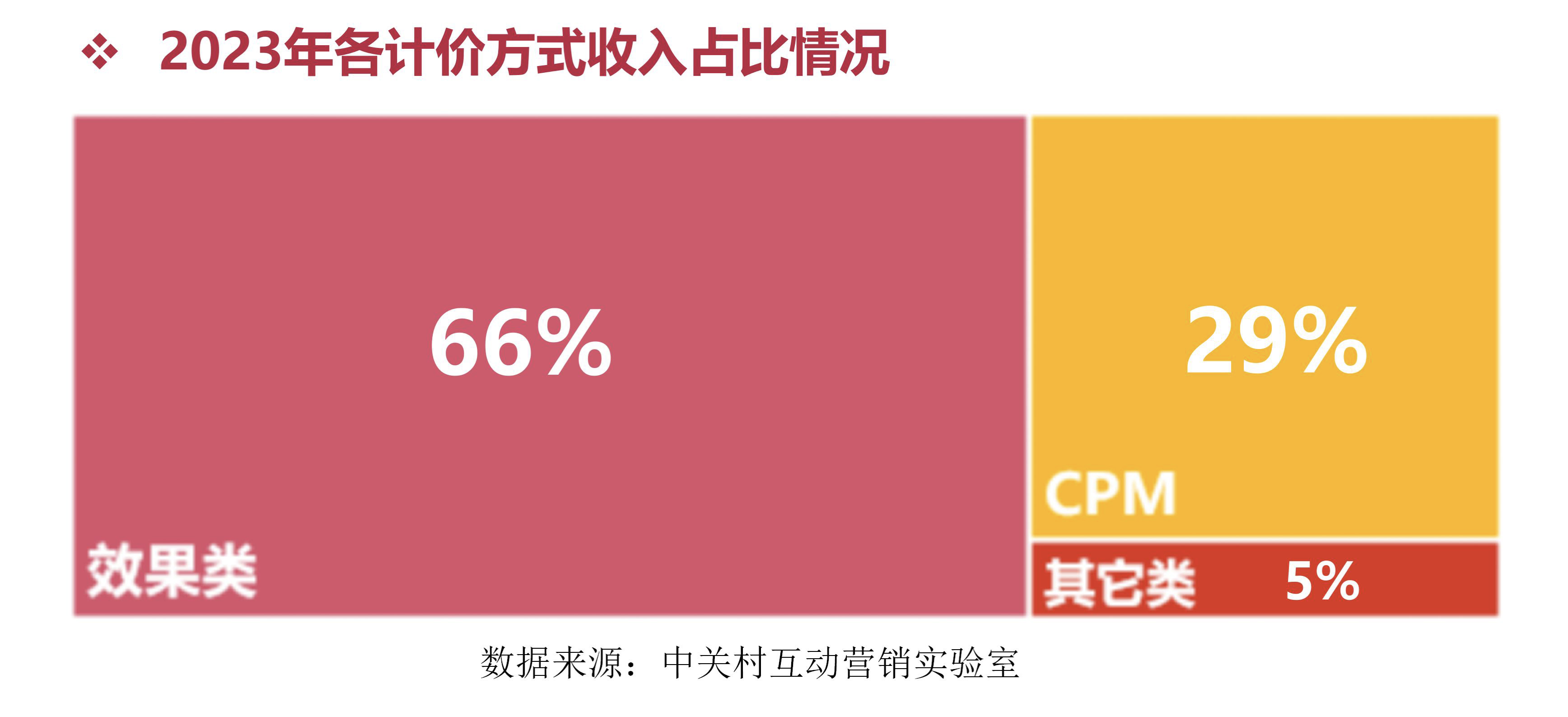 从计价方式看,各类型市场占比出现较大幅度变化:效果类广告较2022年69%的市场份额下降2.7个百分点至66.4%,相应的CPM广告市场份额提升2.6个百分点至28.5%,这说明互联网营销进入结构性调整的阶段,广告主的投放策略也随之发生改变。